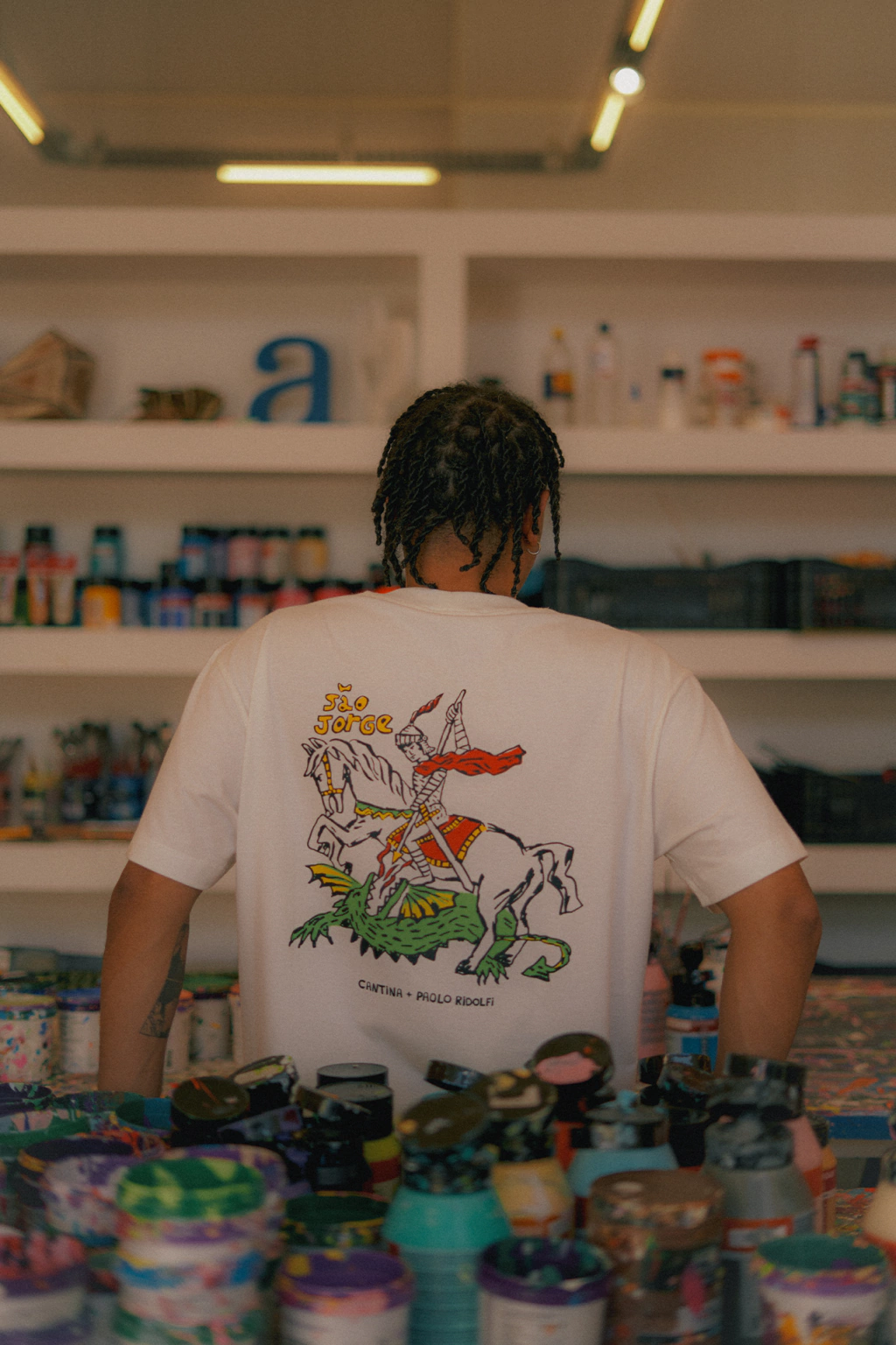 Apresentamos a nossa Camiseta São Jorge, uma peça que celebra esse santo guerreiro, feito em colaboração do artista Paolo Ridolfi.